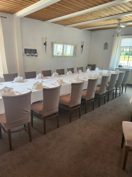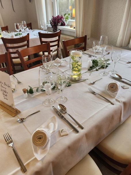 Für Familienfeiern, Weihnachtsfeiern o.a. Gelegenheiten zum gemeinsamen Essen finden Sie bei uns den richtigen Rahmen. Wählen Sie aus unserem Menübaukasten oder besprechen Ihre individuellen Wünsche mit uns, wir gehen flexibel auf Ihre Vorstellungen ein. Für kleine individuelle Hochzeiten oder runde Geburtstage, können Sie auch alle Räumlichkeiten reservieren, neben Tanzfläche, Stehtische und Theke im Gastraum steht Ihnen dann ein Raum für ein Buffet und der grössere Raum zum Speisen und gemütlichem Verweilen zur Verfügung!