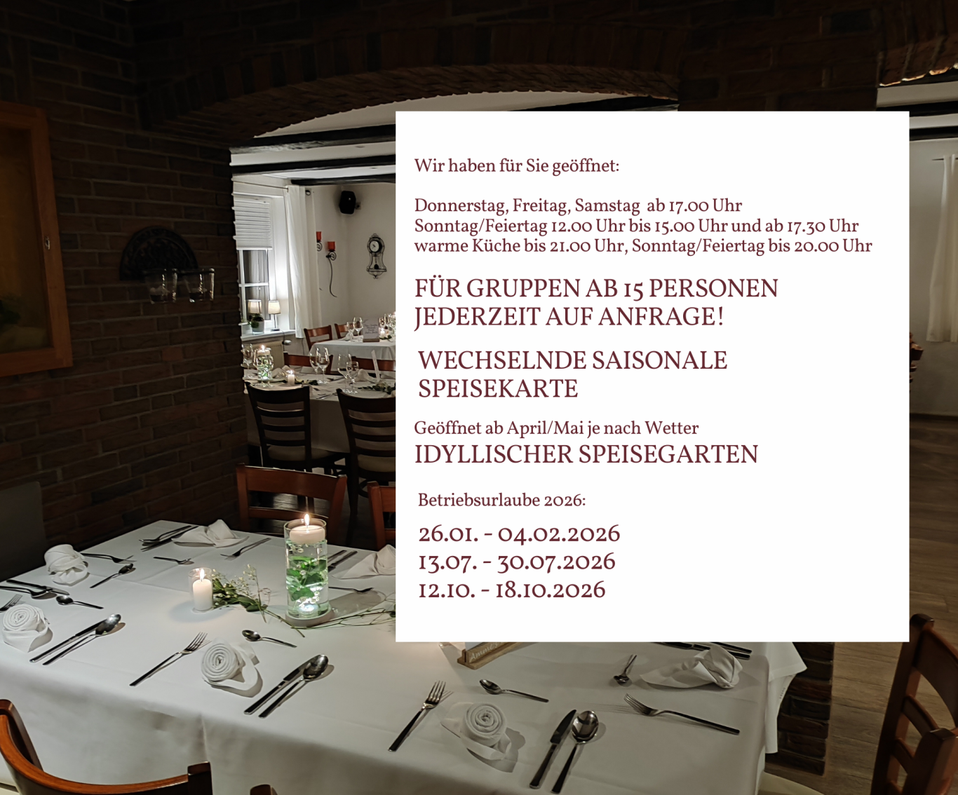 Für Gruppen ab 15 Personen auch außerhalb der Öffnungszeiten/Öffnungstage