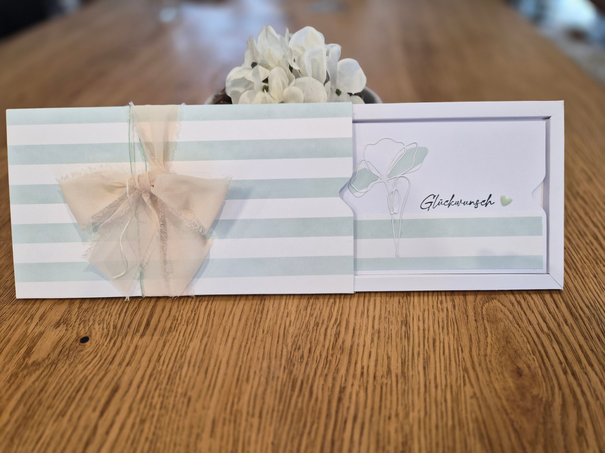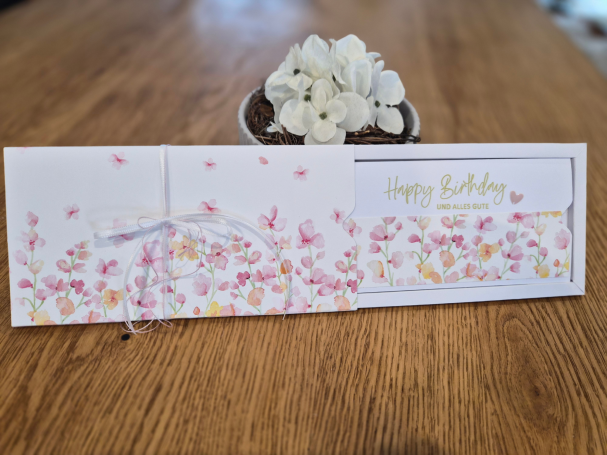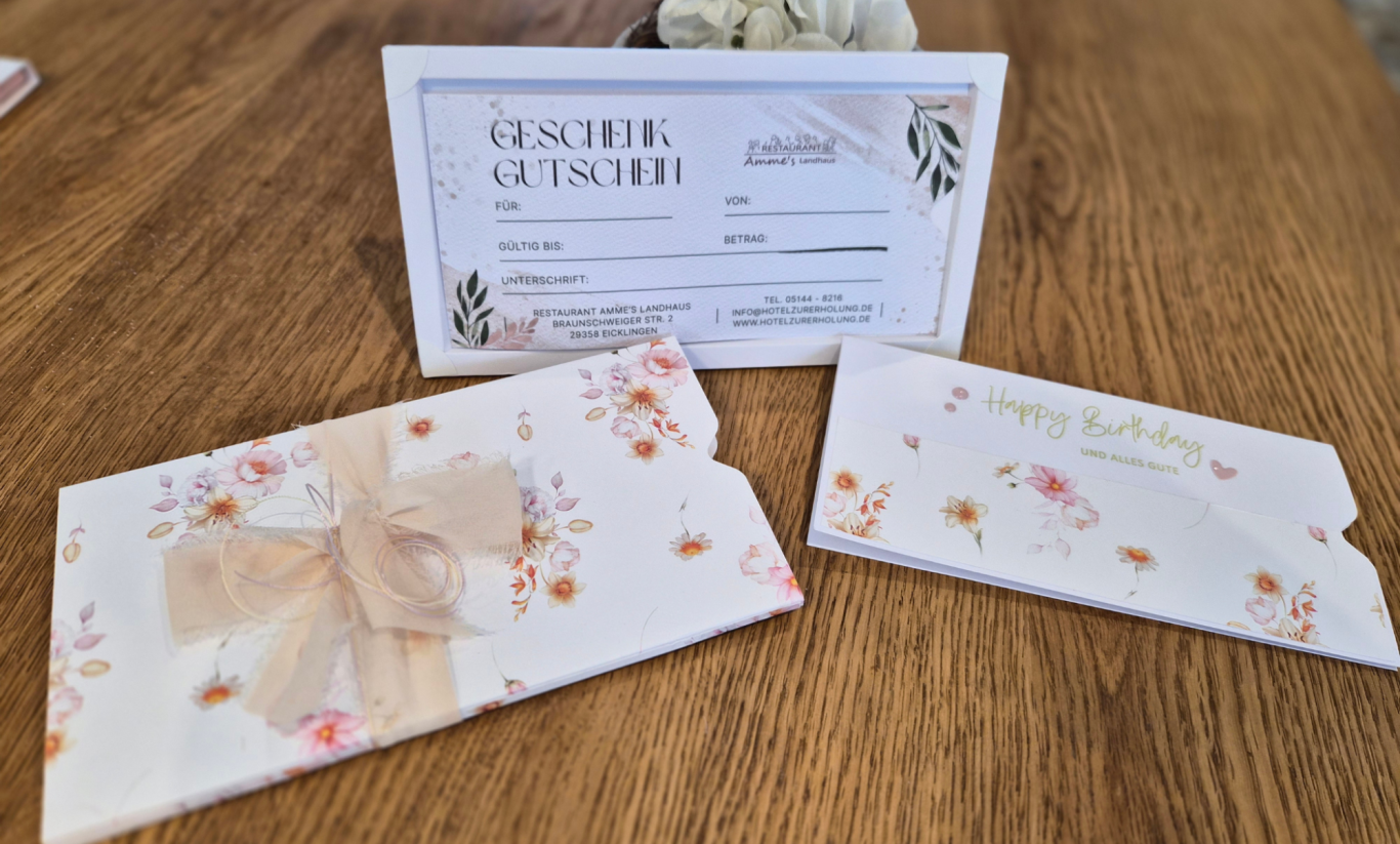 Sie können bei uns handgefertigte Geschenkverpackungen inklusive Glückwunschkarte für unsere Restaurantgutscheine erwerben. Verschiedene Designs vorhanden. Bei entsprechender Vorbestellung auch mit verschiedenen Glückwünschen nach Anlass oder individualisierbar.